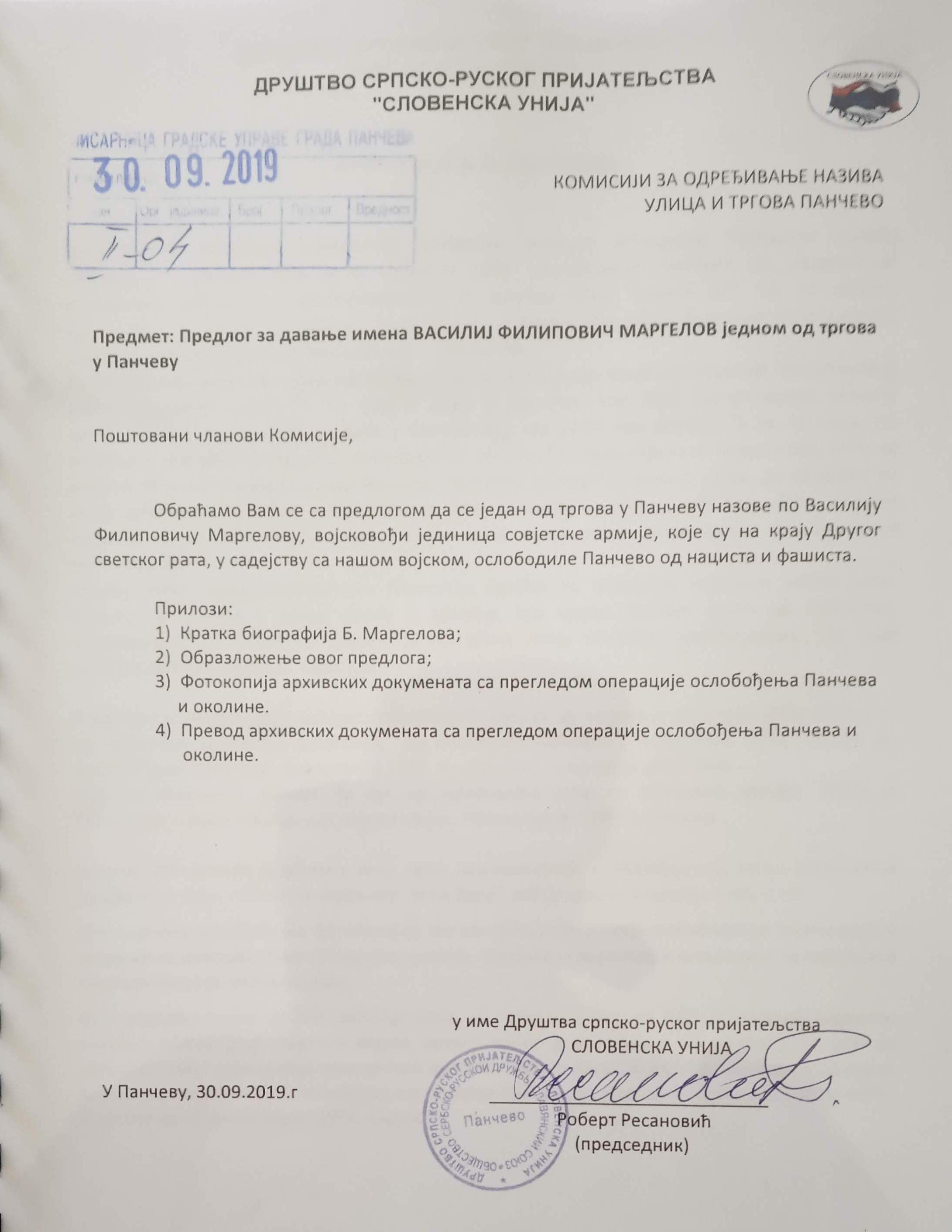 ИНИЦИЈАТИВА ДА СЕ ЈЕДНОМ ТРГУ У ПАНЧЕВУ ДОДЕЛИ ИМЕ „ГЕНЕРАЛА ВАСИЛИЈА ФИЛИПОВИЧА МАРГЕЛОВА“